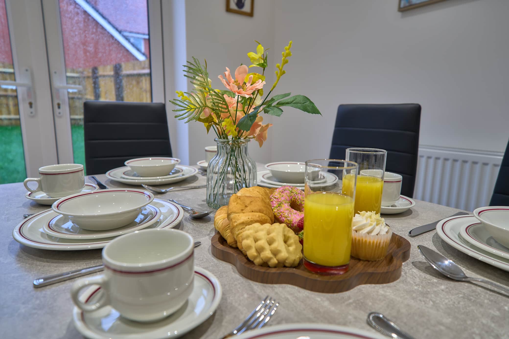 At the heart of the property is a beautifully designed American-style modern kitchen, fully equipped with integrated appliances, including a premium fridge–freezer, washing machine, dishwasher, and high-quality cooking facilities. Everything you need, from cookware to utensils, is right at your fingertips, making meal preparation effortless. The adjoining dining area is ideal for family dinners, casual breakfasts, or planning your day over a fresh cup of coffee.